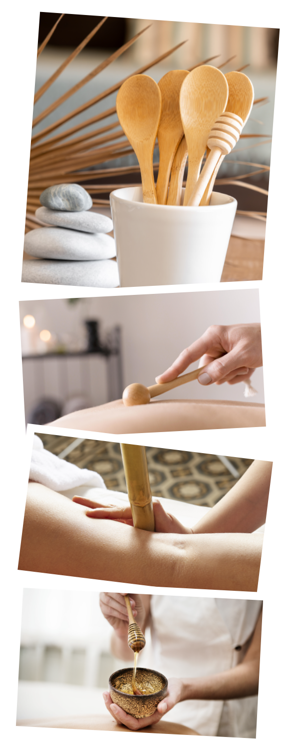 In dieser achtsamen Behandlung arbeite ich ausschließlich mit natürlichen Holzelementen: Bambusstäben, Holzlöffeln, einer Massagerolle und einem Honigheber. Der Körper wird auf sanfte, rhythmische Weise berührt – ohne direkten Hautkontakt mit meinen Händen. Die Methode schafft Verbindung, ohne zu überfordern.
